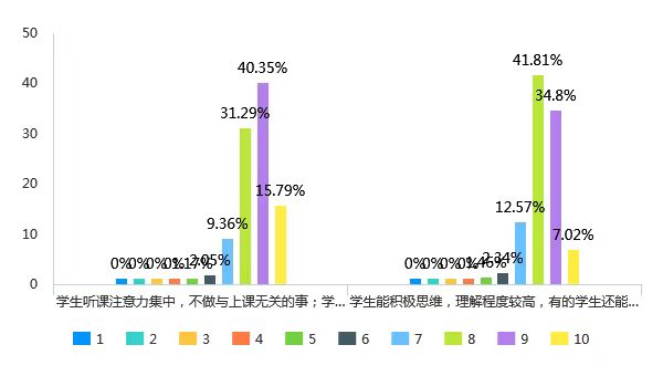 从教学效果这个维度看,平均分为8.41分(满分10分计),“学生听课注意力集中,不做与上课无关的事;学生有强烈的学习兴趣,课堂气氛活跃”方面看出教师的课堂管控和学生的学习状态较好,但是“学生能积极思维,理解程度较高,有的学生还能提出自己不同的见解或问题”方面教学督导高分评价占比不高。