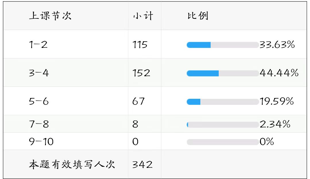 从上课次数来看,上午四节课是学校教学督导开展的主要时间段,7-8节听课次数不多。(表2)