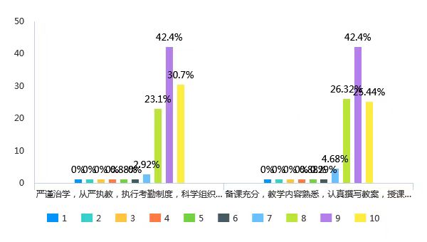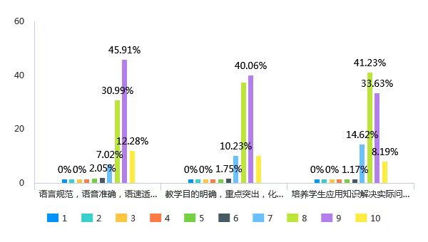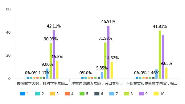从教学方法这个维度看,平均分为8.43分(满分10分计),再从三个方面分析,专家对“语言规范,语音准确,语速适当,条例清楚,表达生动;板书清晰、恰当,布局合理”这个教师基本素养认可度较高,7分及以下占比不到10%,但是“教学目的明确,重点突出,化解难点,详略得当,脉络清晰,注重启发式教学,注重创新精神培育,注重创新思维训练”这个教师的教学设计方面的评价7分以下的占比超过了10%,相关学院和职能部门应该加强这方面的培训和提升工作力度,“培养学生应用知识解决实际问题的能力,教给学生学习和获得信息的方法”这个方面7分及以下的占比更是接近15%,这应当与学校课堂革命尝试不足,课程建设平台缺乏,教学手段单一陈旧,实践教学内容融入不够有关,学生学与教师教的教学模式在新形势下应该有所创新,学校的课程平台建设要加强规划与建设。