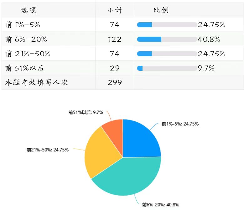 平均学分绩点位于前6%-20%的学生教学信息员占比最高,为40.8%,成绩一般的学生教学信息员占比9.7%,学生教学信息员整体上成绩好,学习欲望强,对学校教学方面的期望高。(详见下图表)