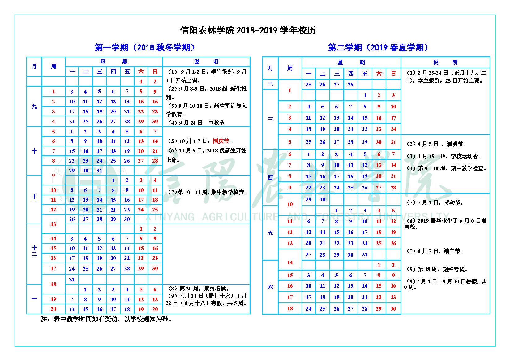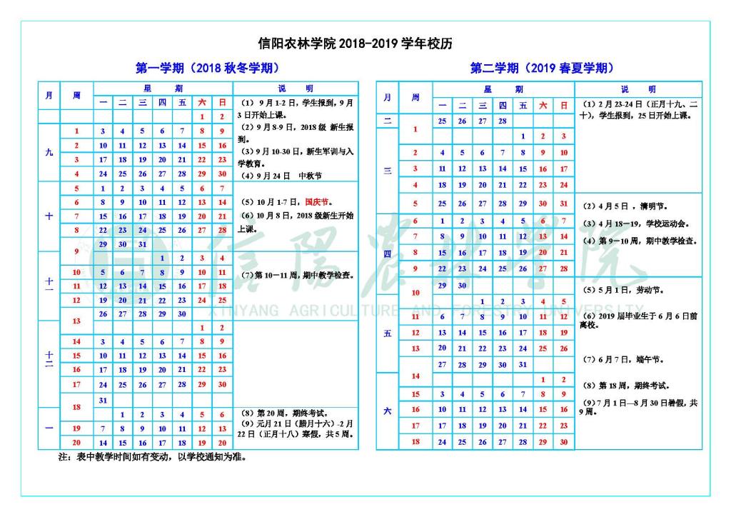 2018-2019学年校历