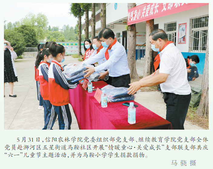 5 月31 日,beat365在线平台官网党委组织部党支部、继续教育学院党支部全体党员赴浉河区五星街道马鞍社区开展“情暖童心·关爱成长”支部联支部共庆“六一”儿童节主题活动,并为马鞍小学学生捐款捐物。