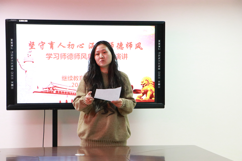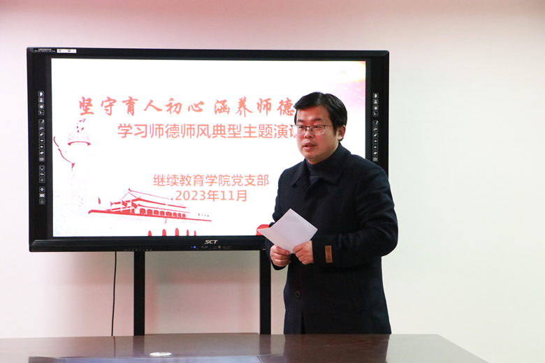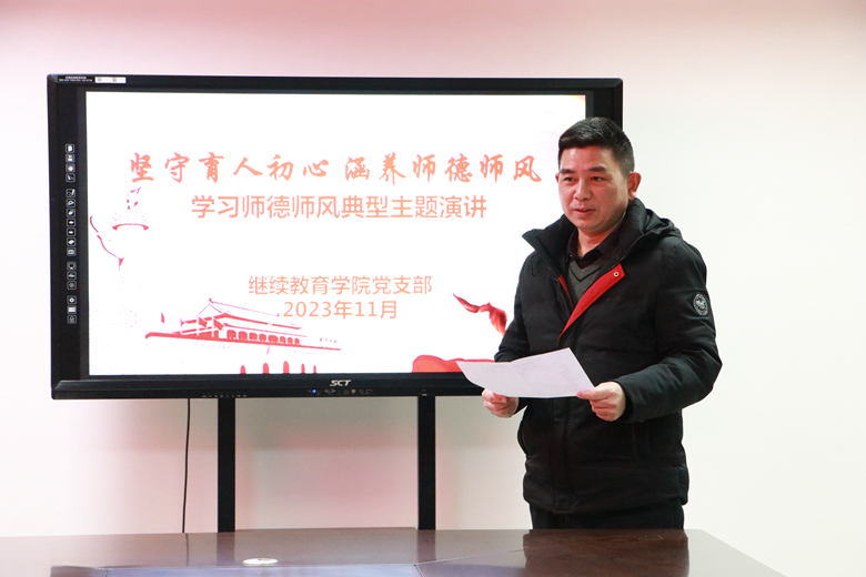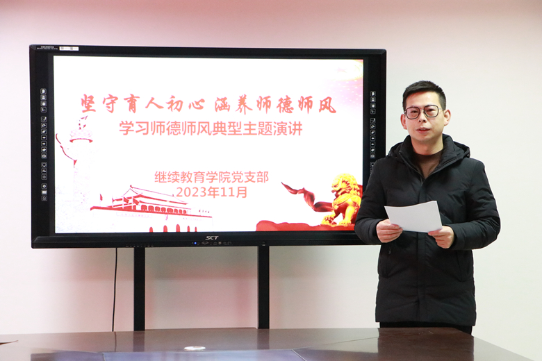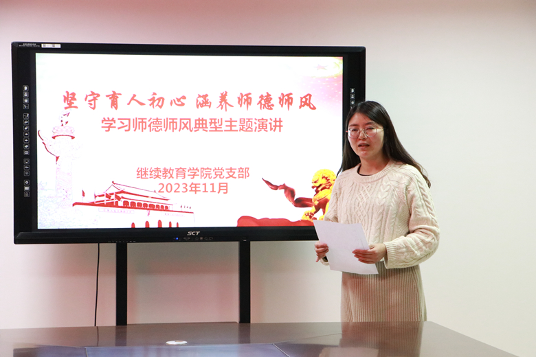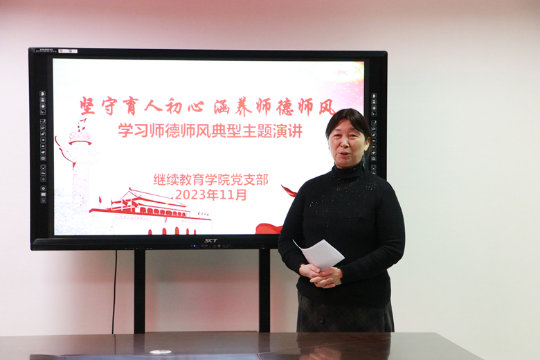 为深入贯彻落实党的二十大精神和习近平总书记关于教育的重要论述,加强师风建设、筑牢师德底线,学习优秀教师先进事迹,传递师德师风正能量,坚定广大教师心有大我,至诚报国的理想信念,11月21日下午,继续教育学院党支部在综合楼三楼第五会议室举行了“坚守育人初心 涵养师德师风”学习师德师风主题演讲。