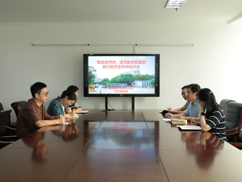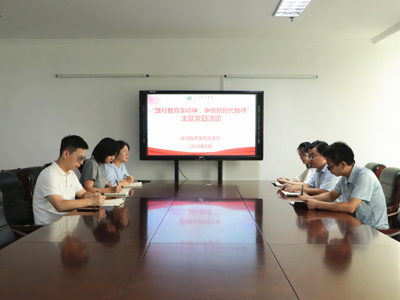 为深入学习习近平总书记关于教育的重要论述,进一步强化教师师德师风建设,激励广大教师积极践行教育家精神,争做新时代的高素质教师,2024年9月10日,继续教育学院党支部在综合楼三楼会议室开展“践行教育家精神·争做新时代教师”主题党日活动。活动由党支部负责人岳宝华主持,全体教师党员参加。