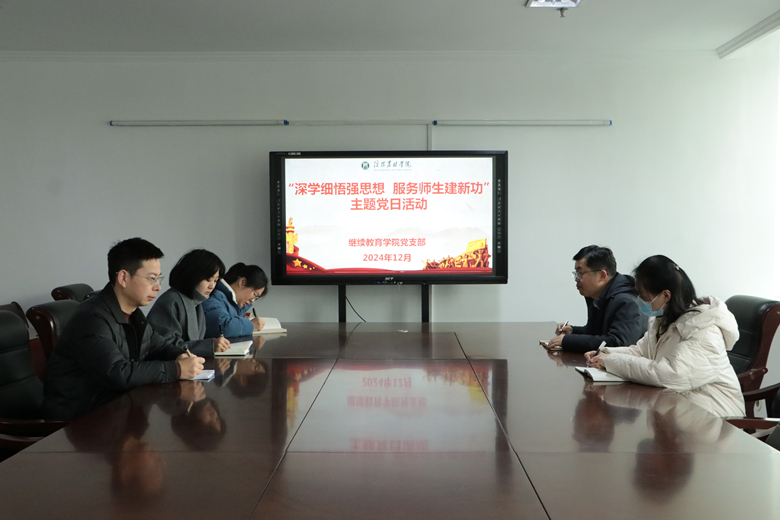为深入学习贯彻习近平新时代中国特色社会主义思想和党的二十届三中全会精神,持续增强党员的党性意识和责任感,提高服务师生的能力水平。12月10日,机关继续教育学院党支部在综合楼三楼会议室开展“深学细悟强思想 服务师生建新功”主题党日活动。活动由党支部书记岳宝华主持活动,全体党员教师参加。