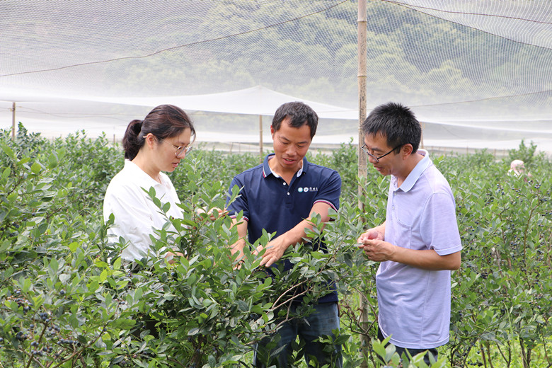 此外,跟踪服务队还到浉河区东双河镇骏翔蓝莓基地实地查看蓝莓种植、销售情况,并与高素质农民培训学员龚本富交流调研。