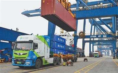 加快发展方式绿色转型 浙江嘉兴立足氢能源领域资源优势,持续拓展氢能示范“应用链”。图为嘉兴港乍浦港区,氢能重卡在集装箱码头运输作业。 本报记者 陈 斌摄