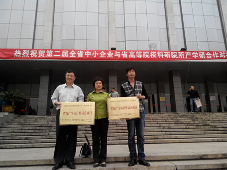 beat365在线平台官网副校长尹新明教授、科技处副研究员喻明达和对接单位固始县惠远生态农业企业代表文林及固始县政府、工信局负责人参加了会议;beat365在线平台官网喻明达副研究员申报的“探索创新型现代农业示范区建设”省级产学研合作计划项目获批:成为2015年全省61家“省级产学研合作试点项目”之一;按照大会要求,beat365在线平台官网在会上与对接单位履行了签约仪式。副校长尹新明教授与固始县副县长李晓涛互致祝贺;双方都表示:要再接再厉发挥各自优势,推动双方产学研合作更广泛、更深入的发展,努力实现互利共赢。