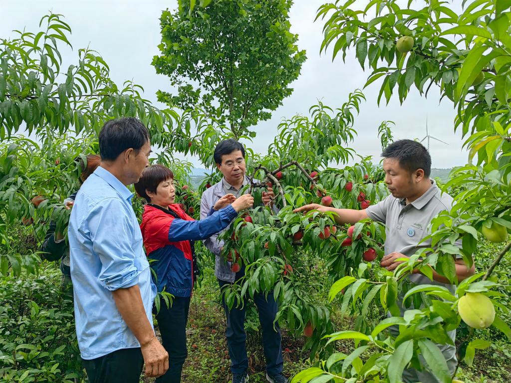 服务队一行首先来到位于光山县马贩镇的观五玫小杂果专业合作社。在合作社理事长易善康的带领下,服务队一行实地查看了桃园的整体扩建规模、生产现状。该合作社种植的桃树前期在汪新娥副教授的指导下,采用了石硫合剂涂干、冬季施足有机基肥和菌肥等措施,今年病虫果大幅减少,桃树流胶病也得到了较好的控制,同时由于去年冬季施足了有机基肥和菌肥,使得今年桃树营养较好,桃果产量和品质都得到了明显改善。服务队提出了近期果实采收管理和采收后树体养护的技术措施。