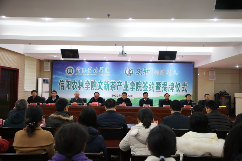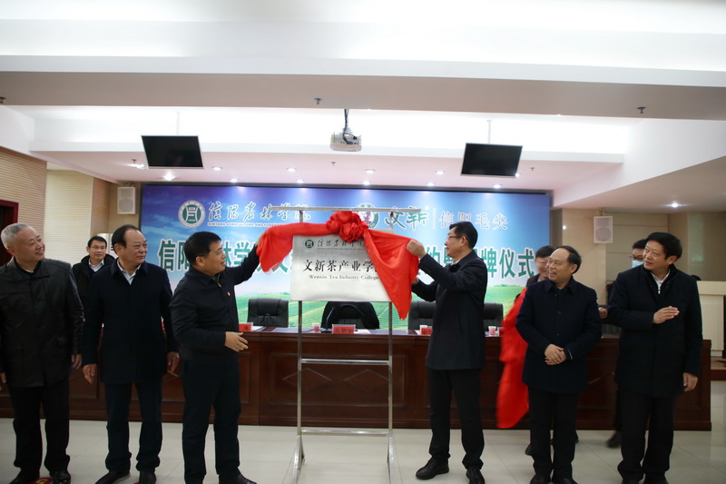 12月23日上午,beat365在线平台官网文新茶产业学院揭牌仪式在学校综合楼一楼会议室隆重举行。信阳市委副书记、市委统战部部长王新会,信阳市人大常委会副主任陈延虎,信阳市政府副市长胡亚才,信阳市政协副主席吴正先,校党委书记余作斌,校长邢勇,信阳市文新茶叶有限责任公司董事长刘文新出席。仪式由副校长赵聘主持,信阳市文新茶叶有限责任公司、校长办公室、科学技术(校地合作)处、茶学院主要负责同志和茶学院师生代表参加仪式。