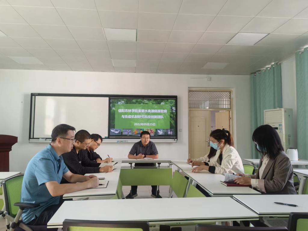 2022年9月25日,动物科技学院组织beat365在线平台官网重要水禽源病原致病与免疫机制研究科技创新团队成员在实验楼2C401进行座谈会。会议由团队负责人曲哲会主持,全体团队成员参加。