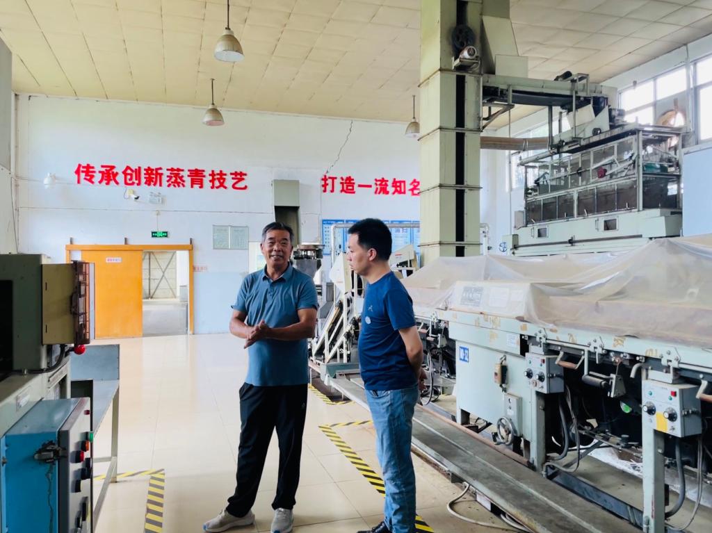陈义教授一行在新县林业和茶产业局高级农艺师董慧与新县大地茶业有限公司负责人李东的带领下参观了信阳毛尖茶的加工生产线,陈义教授针对大地公司现有杀青、回潮工艺上存在的不足,建议高温短时杀青、输送带增设排风扇等措施来实际有效解决公司生产问题。随后,陈义教授一行前往茶园察看茶园长势与茶树品种。