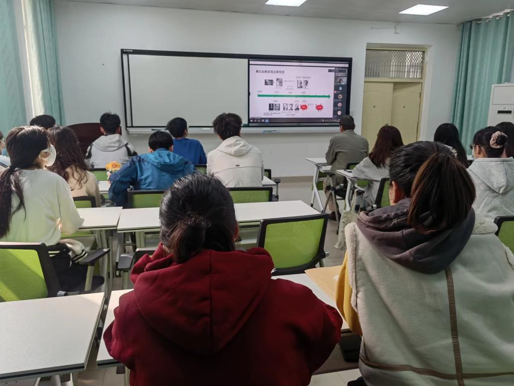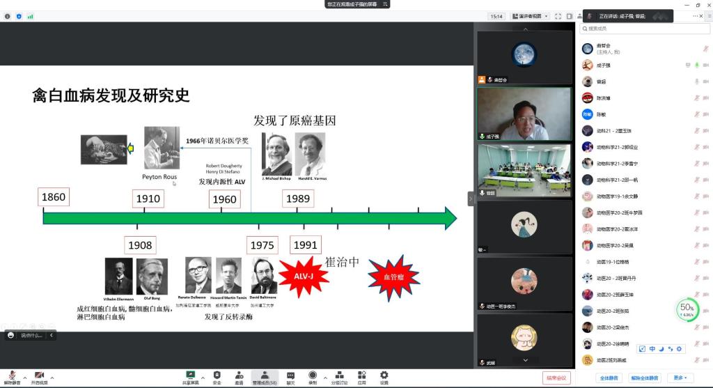 成子强教授结合他本人及科研团队多年来对鸡白血病病毒致病与免疫机制及防控措施的系统研究成果,以及世界上有关禽白血病研究过程展开报告,分别从禽白血病发病与研究史、禽白血病病毒、禽白血病流行病学、禽白血病病理学、禽白血病毒检测技术、禽白血病净化程序和禽白血病净化评估等方面详细的讲述了禽白血病研究的过程及最新进展。以禽白血病研究历史上6位获得诺贝尔奖科学家的研究经历为例,成子强教授鼓励同学们在科研道路上,要敢于创新,要持之以恒,不要轻易放弃自己的“突发奇想”,往往重大研究成果开始往往都不被认可。成子强教授及团队参与了国家禽白血病净化标准制定,主持制定了山东省禽白血病净化的地方标准,在我国禽白血病的净化方面做出了重大贡献。他告诉同学们,科学研究最终一定要为生产服务,成为推动行业发展的动力,希望同学们将来从事科学研究时,要响应号召,将论文写在祖国的大地上。通过本次学术报告,师生们纷纷表示,对禽白血病及其研究过程、前沿水平有了较为系统、深入的了解,深深地被成子强教授及科研团队的科研精神所感动。