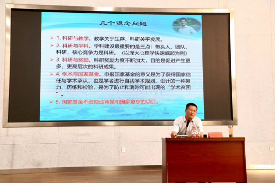 何教授主要以国家社科基金项目申报为例,从选题、论证、创新点、前期研究成果及研究团队、参考文献、项目类别的选择等几个方面进行了详细的讲解。全面梳理了课题申请关键因素、课题申报的常见问题等,并和参会教师分享了个人从事科研工作的经验和体会,指导大家要结合研究方向、工作实际和个人兴趣中寻找学术研究的切入点及契合点,从而确定一个可行性强、研究价值高的选题,这样才能在后期的研究中顺利开展,也更能够维持研究的深度和广度。