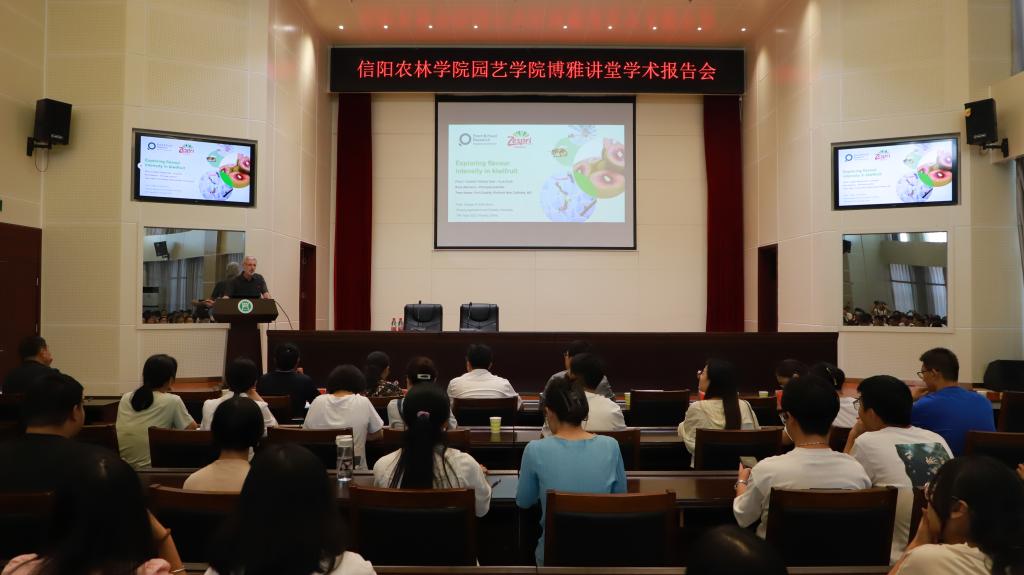 2023年9月19日下午,园艺学院在图书馆六楼报告厅举办了“博雅讲堂”学术报告会。会议邀请了新西兰植物与食品研究所高级科学家Ross Atkinson博士作报告,报告主题为“猕猴桃风味强度探究(Exploring flavor intensity in kiwifruit)”。华中农业大学副教授曾云流博士、园艺学院240余名师生参加了报告会,会议由祝曼博士主持。