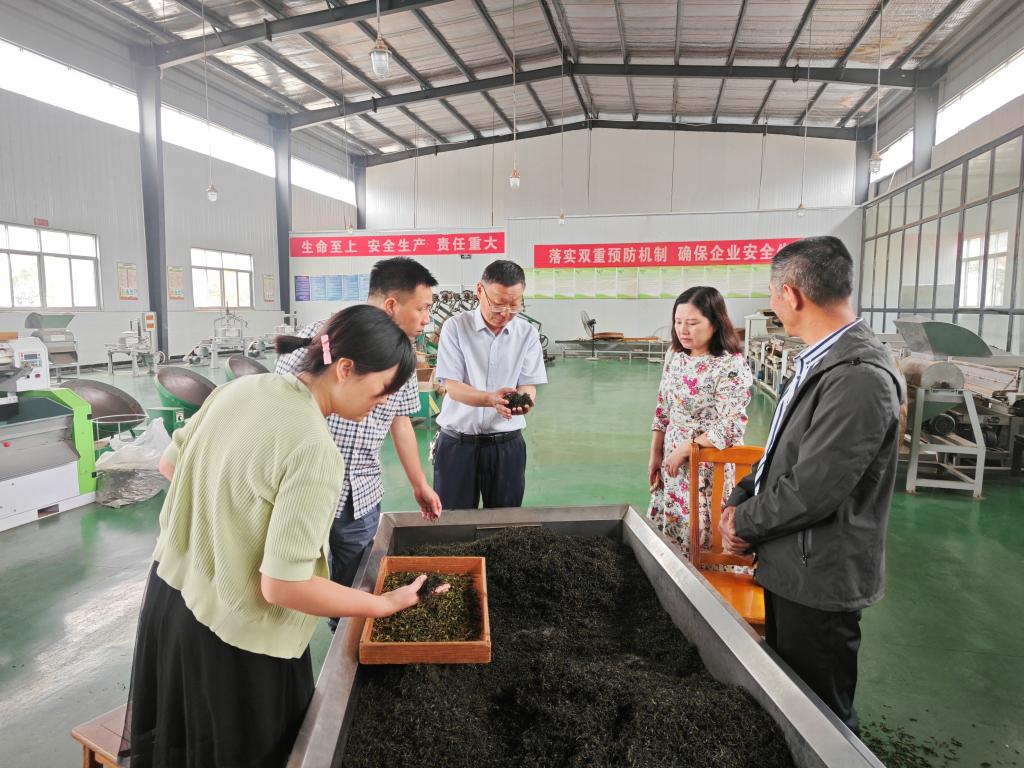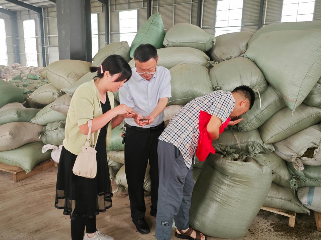 深入茶区现场指导企业提高夏秋茶低档资源利用。5月30日,团长郭桂义教授带领科技特派员陈义教授、罗金蕾博士、团队成员王晶晶老师前往光山县指导茶叶企业对夏秋茶低档资源进行利用。夏秋茶不采,大部分茶叶加工厂都处于停产和半停产状态,各种有效资源得不到充分利用。服务团先去往四季香茶业,郭桂义查看了企业收制的毛茶,详细询问了公司负责人韩忠学收购价格及后续利用,信阳地区制作名优绿茶历史悠久,但对夏秋茶的利用不足,科技特派员提出可以依靠国家重点研发计划项目(课题“大别山区茶叶提质增效技术集成与应用示范”子课题 “信阳毛尖品质提升与示范”、“信阳毛尖加工示范与夏秋茶资源高值化开发利用”)将低档夏秋茶制作茯茶、青砖等原料粗老的茶类,可以开发扩展夏秋茶资源利用的方式,提高茶农茶企收入,丰富信阳茶叶茶品,进一步推动我省茶产业高质量发展。