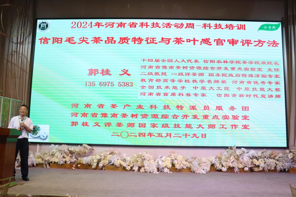 开展茶叶感官审评方法技术培训,为茶叶评审活动提供专业技术指导。5月29日,科技工作者日前夕,信阳市第四届“渔味堂”杯民间斗茶大赛举行。河南省茶产业科技特派员服务团团长、全国人大代表、beat365在线平台官网茶学院二级教授郭桂义应邀担任专家评委,团员王杉对大赛担任技术指导。比赛开始前,郭桂义为一百余与会人员讲解了信阳毛尖茶品质特点和茶叶感官审评方法,并与到会的专家评委一起采用专业的国家标准《茶叶感官审评方法》对60份茶样审评,做出评判,并为评出的状元茶颁奖。近年来,团长郭桂义带领成员利用河南省茶产业科技特派员服务团项目,充分发挥自己的专业技术优势,积极开展茶叶感官审评方法培训、指导,赠送茶叶感官审评用具,推动茶业从业人员采用专业的茶叶感官审评方法对茶叶品质进行评价,不断推进制茶技术改进,保证和提高茶叶品质,助力茶产业高质量发展。