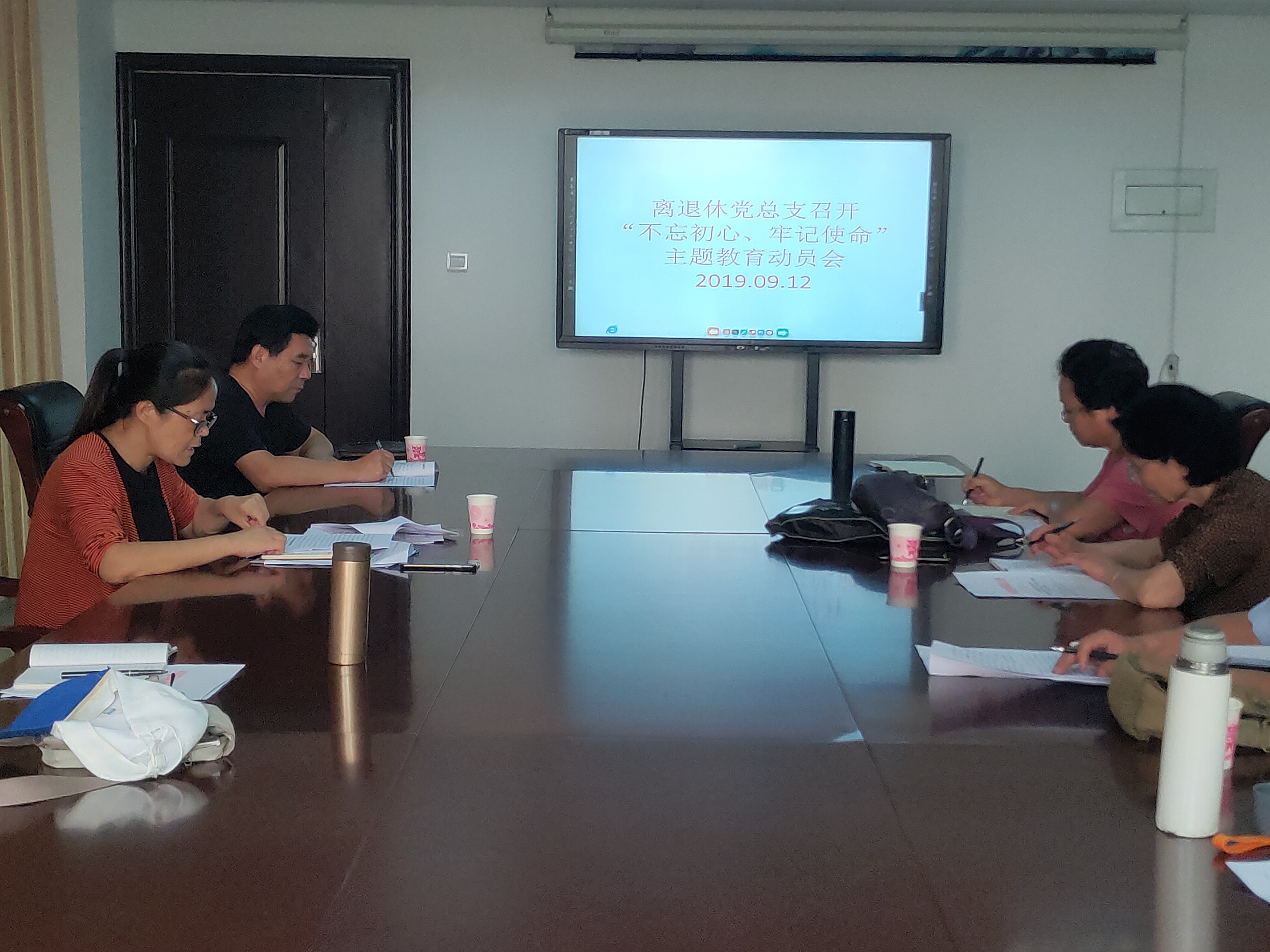 2019年9月12日下午,离退休党总支于综合办公楼508会议室召开了“不忘初心、牢记使命”主题教育动员会,离退休党总支委员、各党支部书记和离退休工作处全体党员参加会议,会议由离退休党总支书记黄春晖主持。