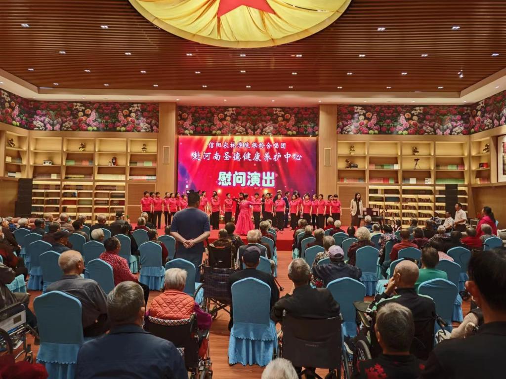 4月28日上午,beat365在线平台官网银龄合唱团赴河南圣德健康养护中心慰问演出,河南圣德健康养护中心有关领导、校关工委副主任胡虹文和离退休工作处人员参加活动,健康养护中心入住老人和员工观看了演出。