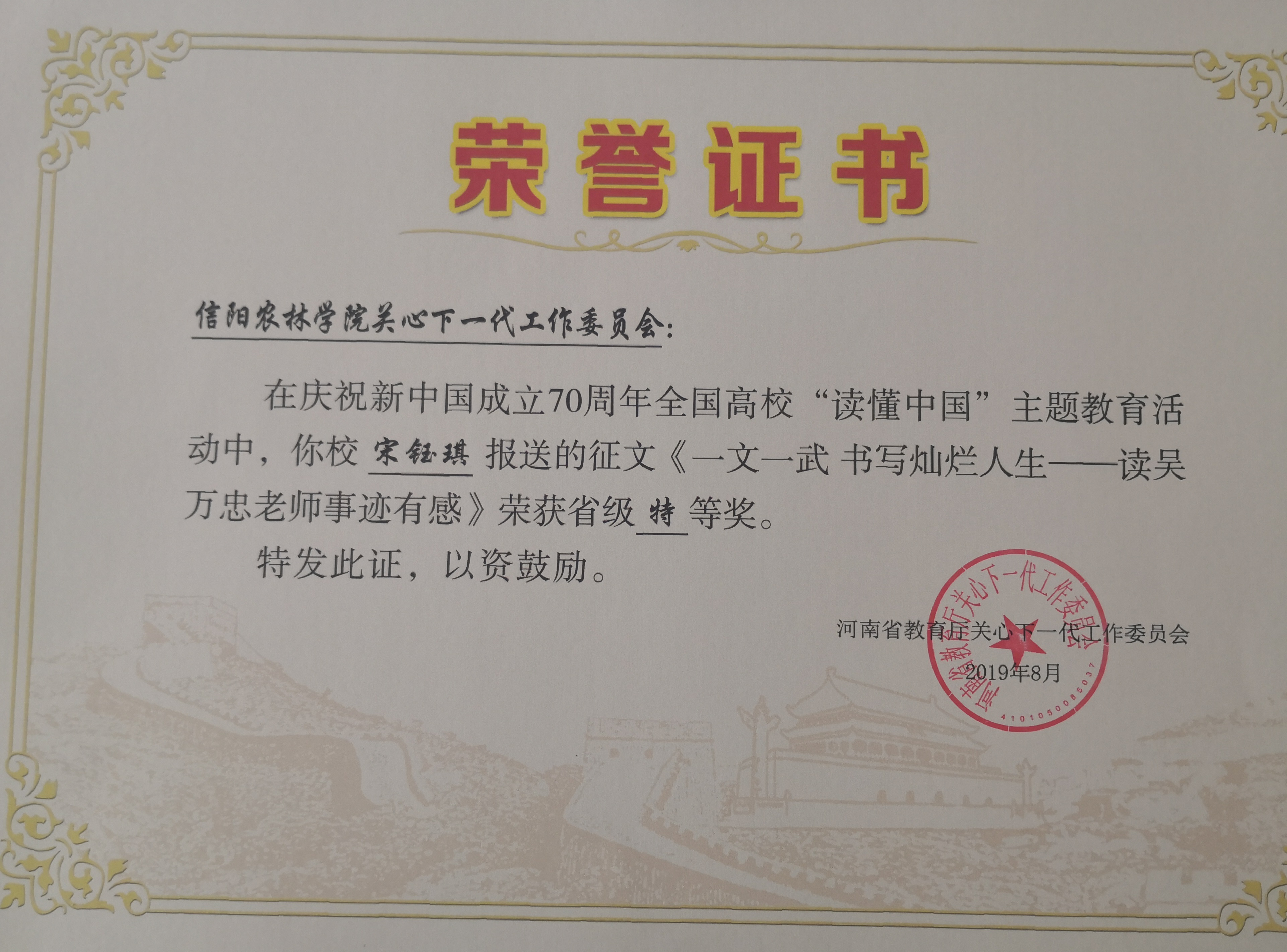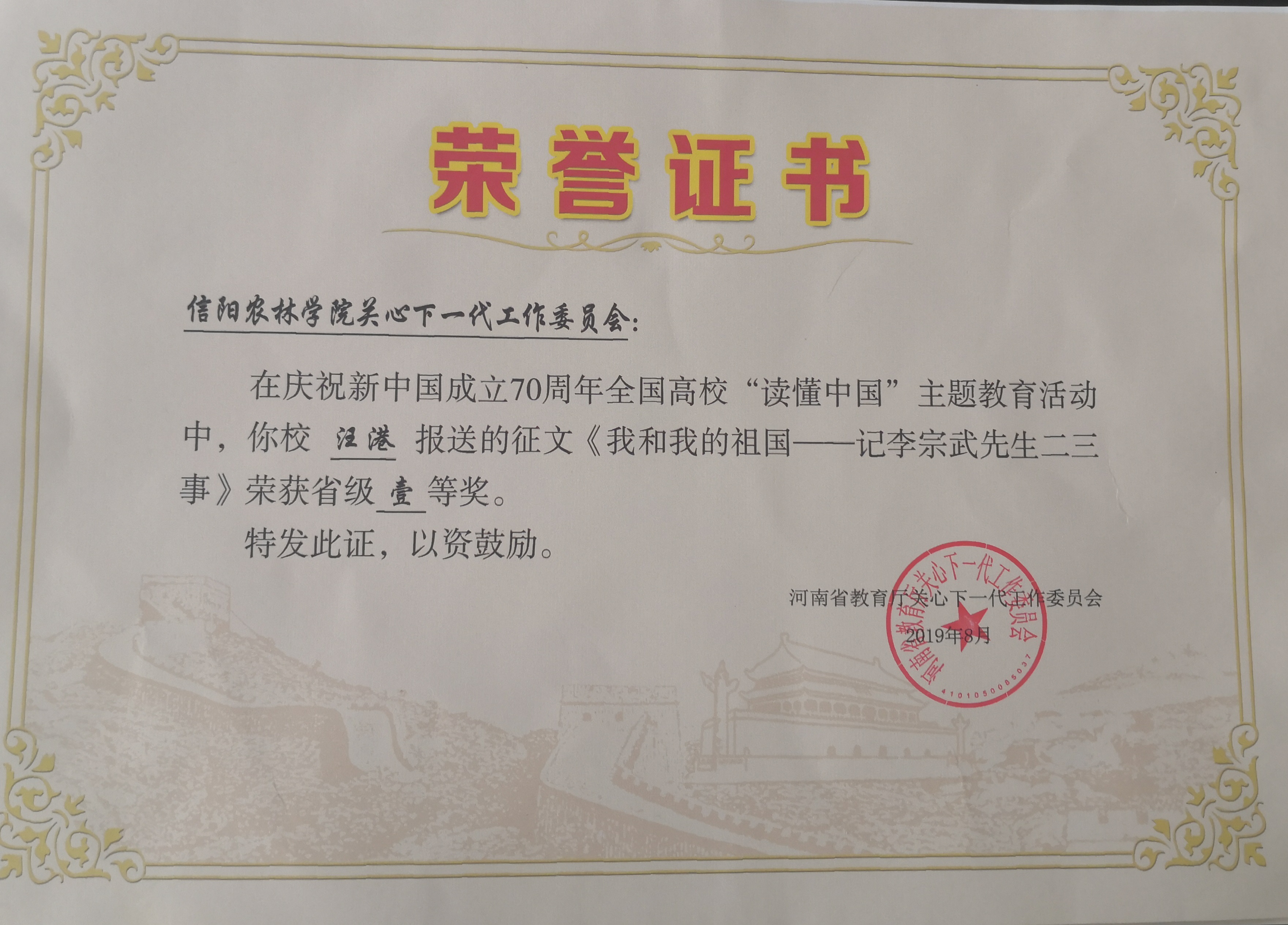 为庆祝新中国成立70周年,在省教育厅关工委开展的“读懂中国”主题教育活动征文比赛中,beat365在线平台官网离退处按照省教育厅要求,高度重视,积极组织征文和微视频参赛。选送征文作品获得特等奖一名,一等奖一名,二等奖四名,其中宋钰琪老师的征文《一文一武书写灿烂人生——读吴万忠老师事迹有感》荣获省级特等奖,汪港同学的征文《我和我的祖国 ——记李宗武先生二三事》荣获省级一等奖、许江博同学的征文《与祖国同行》荣获省级二等奖、刘竞尧同学的征文《我爱我的祖国》荣获省级二等奖、陈旭欣、李潇含同学的征文《我与祖国共命运》荣获省级二等奖。报送的视频《读懂中国——韩润山专访》、《读懂中国——吴殿久专访》、《读懂中国——卜楚军专访》荣获微视频类二等奖。