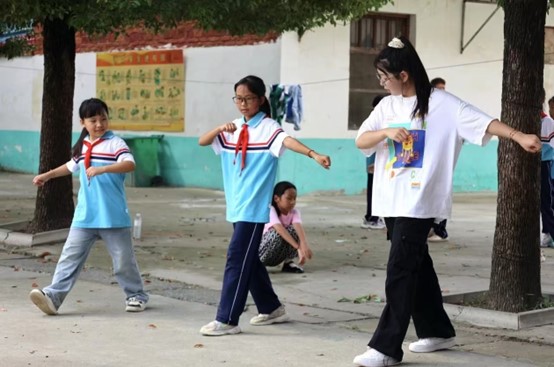 以热爱充实自我,以笃行丰迎青春,正是花儿一样活泼好动的年纪,律动舞蹈课的安排受到学生们热烈追捧。服务团成员王彩艺用一节课时间教学生们跳了《爱出发》,上课时小朋友对新鲜事物的期待与认真,结束后围在服务团老师身边恋恋不舍的场景令人动容。
