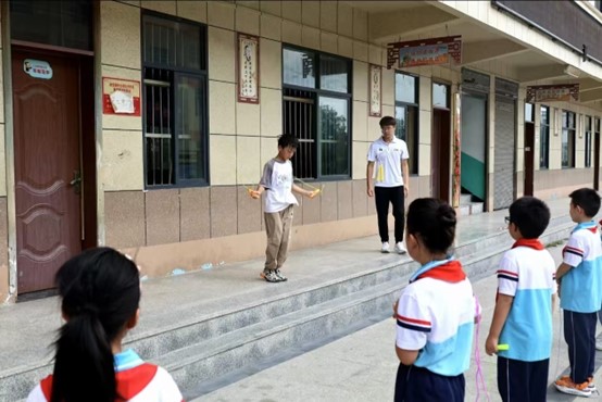 “希望通过花样跳绳课,在他们的世界里种下一颗兴趣的种子,生根发芽,期待着未来能绽放出绚丽的花朵。”服务团成员张柏鑫是2023年度全国跳绳联赛总决赛“连续三摇跳”冠军和“3分钟单摇”亚军获得者,他和龚河瑞分别向同学们讲授了全国跳绳比赛的盛况,展示了花样跳绳的技术技巧,同学们分场次进行了花样跳绳体验。