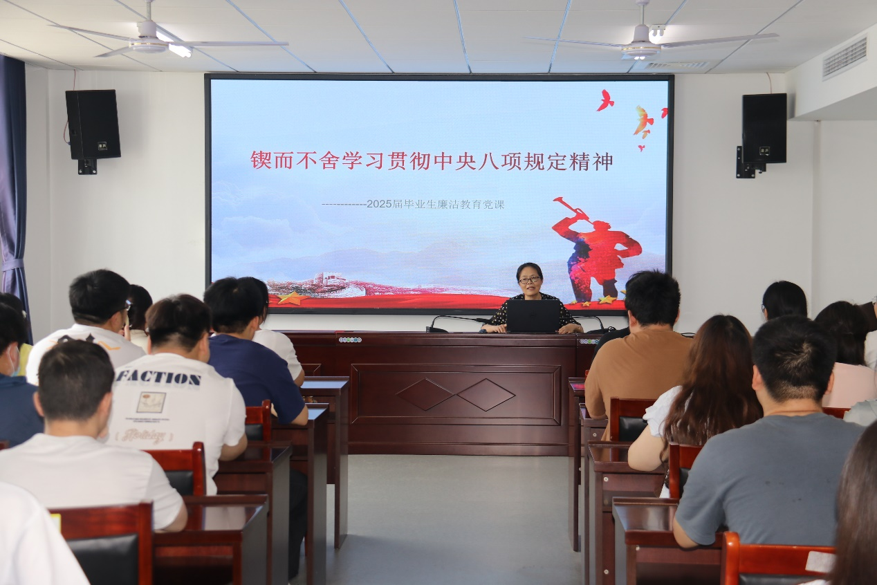 2025年5月28日,林学院党委书记黄春晖在林学院310会议室为2025届毕业生党员讲授了一堂题为“锲而不舍学习贯彻中央八项规定精神”的专题党课。此次党课旨在深化毕业生党员的纪律观念和廉洁意识,帮助他们系好职业生涯的“第一粒扣子”。