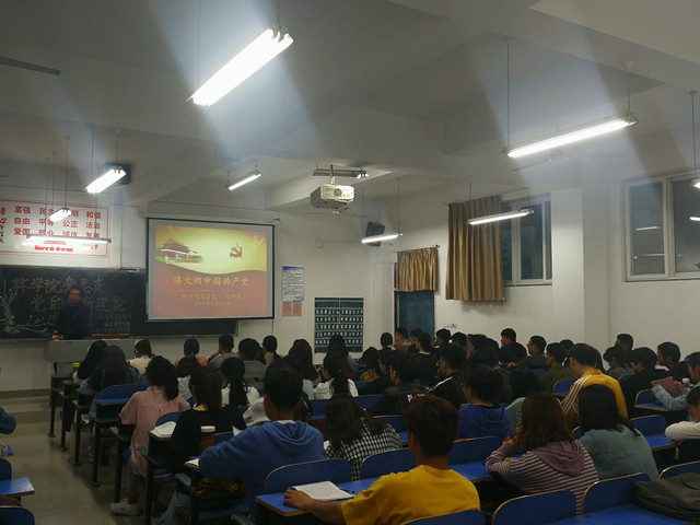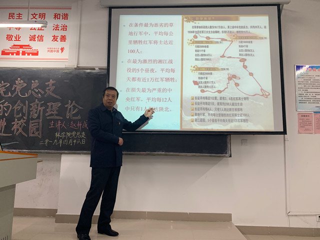 4月16日晚,林学院党总支书记赵师成在一教A103教室为学生第一党支部、第二党支部学生党员、预备党员、发展对象和本期入党积极分子上党课,此次党课主题是:“伟大的中国共产党”。