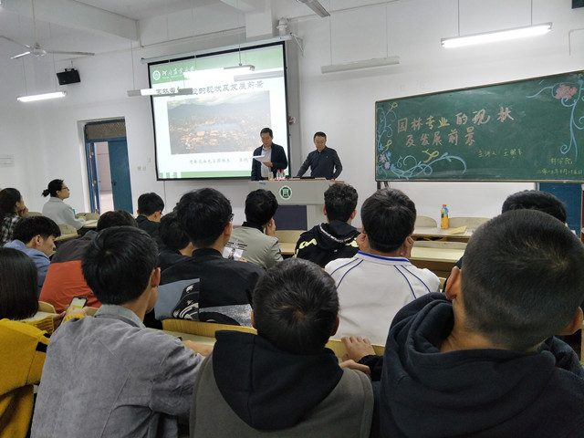 25日上午,河南农业大学园林系主任王鹏飞教授报告题目“园林专业的现状及发展前景”,林学院院长孙耀清教授主持,我院19级146名园林专业学生和园林专业教师参加。王教授从事风景园林与城乡规划专业的教学与研究工作多年,获河南省科技进步二等奖5项,出版专著7部,发表专业论文80余篇,主持规划设计项目60余项,指导的研究生获第六届(2016)“艾景奖”国际园林景观规划设计大赛金奖和2016“园冶杯”大学生国际竞赛二等奖。王老师的报告从“园林是什么、如何要建造人们满意的园林、园林专业的你将何去何从”三个问题深入浅出阐述园林专业的专业思想,王教授的报告既富有理论性,又通俗易懂,师生们都受益匪浅。