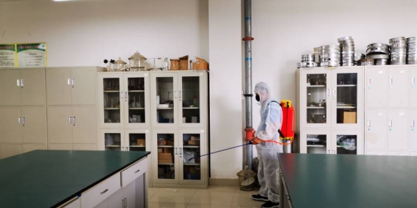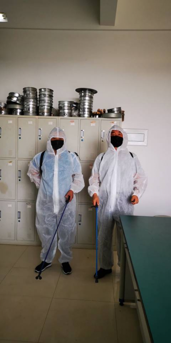 根据学校疫情防控的网格化管理工作要求,同时也为了师生能在有序、干净、环境良好的实验室进行内业成果的整理,实验教学中心段占生、王传福两位工作人员每天两次定时对学生使用过的实验室进行集中消杀处理,上午9:40-9:55分,下午16:45—17:00分,另外,考虑到目前早晚温差大,中午还是比较炎热,还为外业实习的学生们准备了常用的防蚊虫叮咬、清热解毒藿香正气水、创可贴及预防感冒的冲剂等药品。
