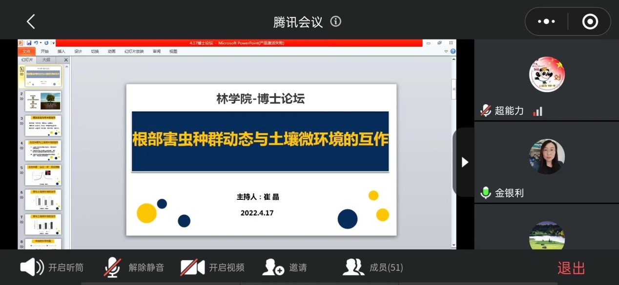 4月17日上午,林学院博士论坛第一期“根部害虫种群动态与土壤微环境的互作”在腾讯会议顺利召开。科技处史洪中处长、林学院孙耀清院长、李文杨副院长、王辉副院长及农学院、林学院、园艺学院等学院部分教师和学生参加了此次论坛。论坛由林学院崔晶博士主持。