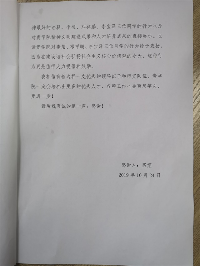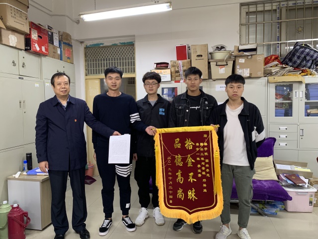 几经辗转,11月4日下午,失主柴先生又联系上了我院领导并专程为我院三名同学送来锦旗和感谢信,再次当面道谢。学院领导在了解此事后,高度重视,当场对这些同学表彰,同时号召全院的师生向他们学习,为全面发展社会主义核心价值观做出自己应有的贡献。