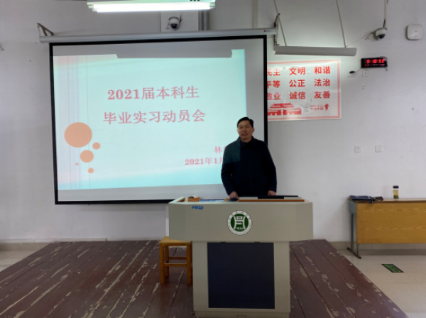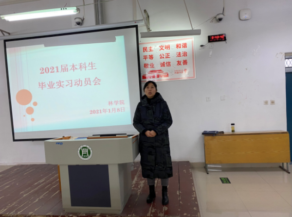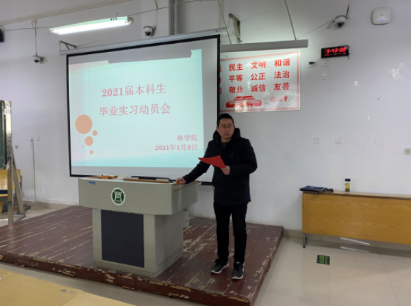2021年1月8日上午9点,林学院在二教406教室召开2021届毕业生毕业实习动员会。动员会由教学秘书张广波主持,院长孙耀清、教学副院长王辉、院党总支副书记肖亮、林学教研室主任李文杨、园林教研室副主任乔良、毕业班辅导员董艳、徐俊杰、刘文祥,以及2021届237名毕业生参加此次实习动员会。