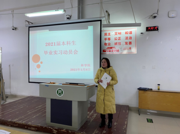 教学副院长王辉针对实习规定和要求进行详细的解读,并强调了毕业实习是专业教学的重要环节,希望同学发扬吃苦耐劳、勇于接受磨炼的精神,转变眼高手低、盲目攀比的择业观,树立劳酬匹配和着眼长远的就业观。最后,林学院教师代表、林学教研室主任李文杨针对实习就业与同学们进行了经验分享。