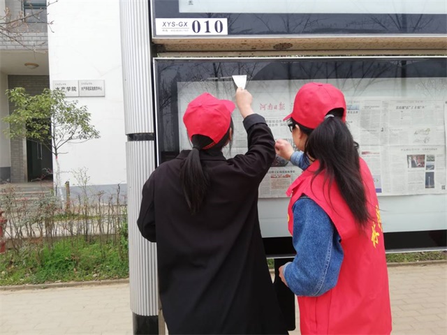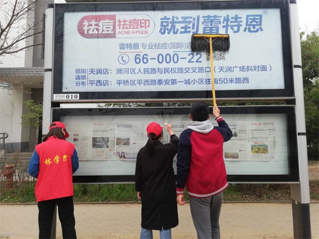 示范班同学们进行了责任区和校园内宣传栏的清扫工作。在进行简单的分工后,同学们开始了垃圾的清理和宣传栏的擦洗。工作中,同学们不怕脏、不怕累,不放过任何一个小角落。经过近半个小时的清理,散落在责任区的垃圾被清理一空,校园中的宣传栏也被擦洗的焕然一新。