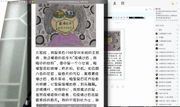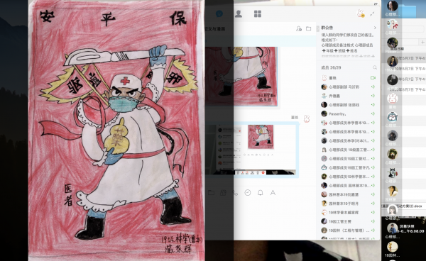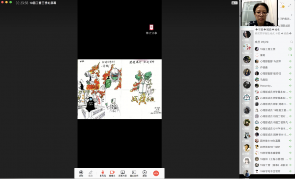 2020年5月25日晚,林学院用QQ视频举办了题为“逆境携行 你我同心”的线上分享会。本次分享会由林学院董艳老师主持,林学院心理部成员及参加此次漫画、征文的同学参与讨论。部分同学对自己的作品进行了解读,对目前的生活、学习情况及个人感悟进行分享。