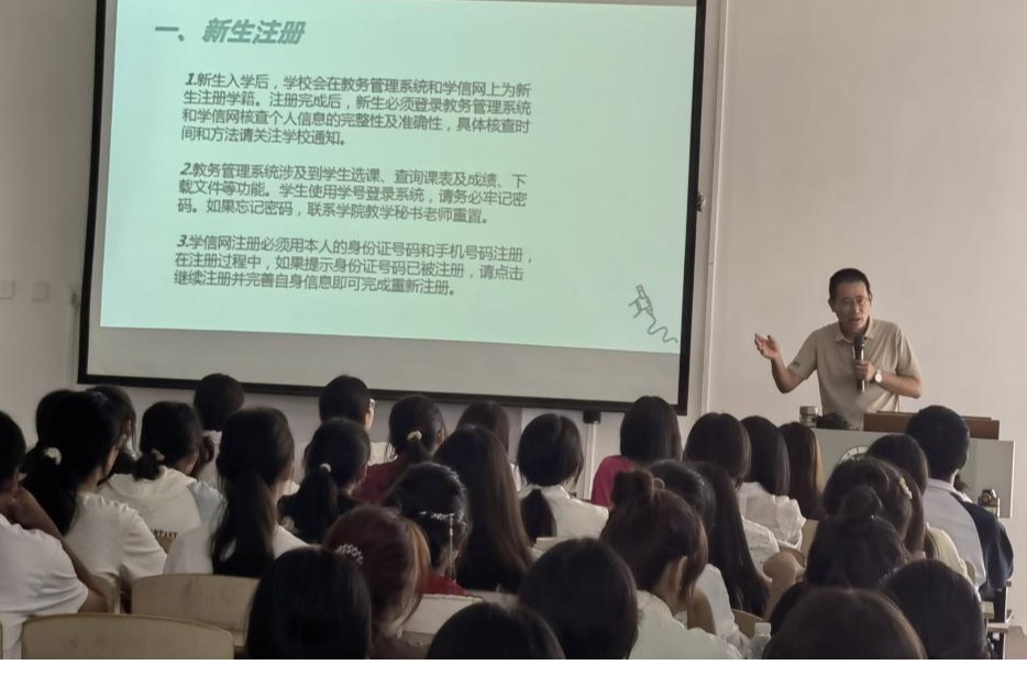 副院长张广波围绕新生注册、学籍学分、选修必修课程、综合素质测评办法、教务系统使用等方面做讲解,帮助学生了解课程开展情况以及毕业条件。