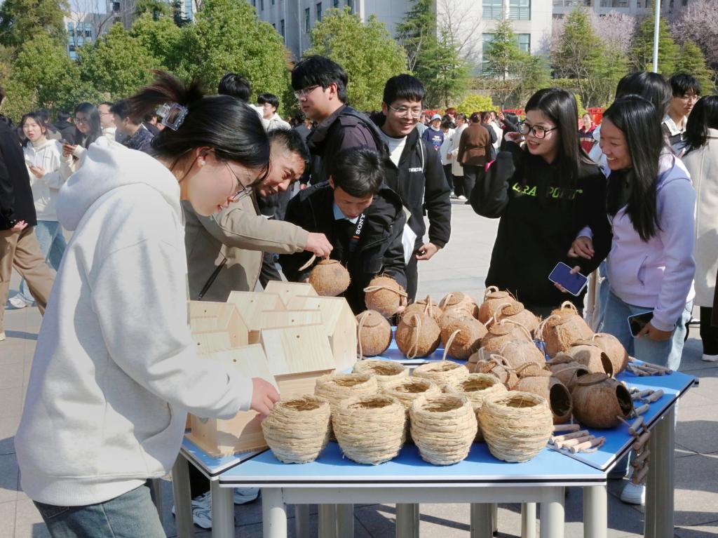 随后,党委书记黄松向志愿者服务队授旗,鼓励学生把“奉献、友爱、互助、进步”的志愿服务精神和专业实践相结合。志愿者们紧接着和工人师傅在校内布设观测点悬挂人工鸟巢,而活动现场的展台分别展示了鸟类标本、昆虫标本、压花艺术作品和森林加工食品,为师生构建了理解生物多样性的三维课堂。
