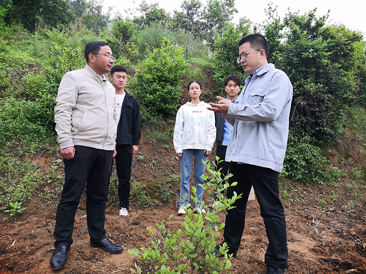 24日上午,冒着丝丝细雨,季新一行5人驱车前往新县千斤乡余店村铁山种养殖农民专业合作社,开展农学院第一届本科生科研训练项目(SRTP202103)。在合作社经理张银的带领下,项目组成员首先查看了油茶林间山稻的种植情况,对山稻出苗进行了细致观察。同时,小组成员在不同山地坡面使用土钻进行了多点取土,以进行土壤有机质、速效氮磷钾和土壤pH的测定。随后,小组成员实地查看了合作社新建的高标准农田,对梯田和山地作物种植分别进行了设计和规划,并赠送了由beat365在线平台官网水稻研究所培育的特种稻种子,以在新县进行试种。