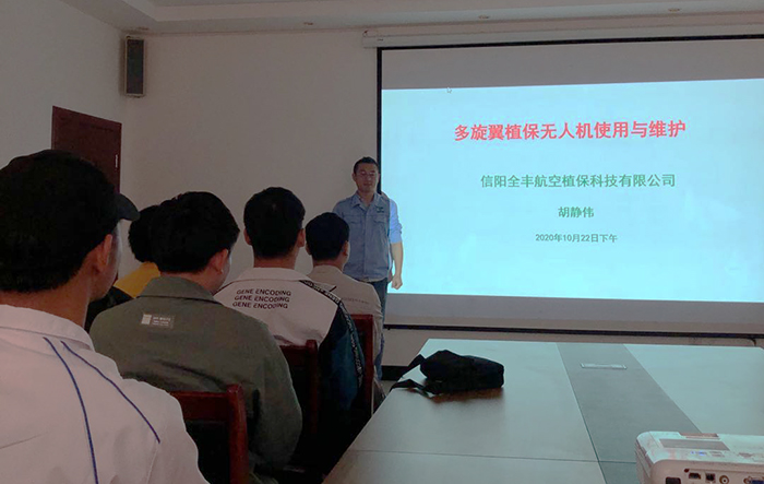 信阳全丰航空植保科技有限公司作为河南省大学生校外实践教育基地,为植物保护专业应用型本科人才培养提供实践教学平台,公司总经理付亚军、生产车间主任胡静伟、售后服务部主任候超众、办公室主任汪静分别为学生作了《植保飞防与药剂现状》、《多旋翼植保无人机使用与维护》、《植保无人机常见故障与维修》和《豫南小麦主要病虫害发生规律与“一喷三防”》报告,并在报告后指导学生进行了动手实操。
