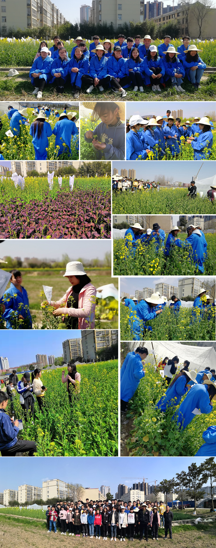 进入基地,大家就被眼前一片片金黄色的油菜花所吸引,阵阵花香扑鼻而来,令人心旷神怡。来到田间,首先看到了油菜地中有许多搭建蚊帐的小屋,同学们带着问题去观察和思考。在王老师的讲解和示范下,同学们很快明白了原来那些是油菜的不育系和保持系按比例间隔种植,即繁殖不育系,让大家瞬间地联想到书本上的父母本及相关知识,同学们能很好地理解和巩固书本知识。其次同学们了解到油菜类型的特点,并能够一一区分。最后,很荣幸邀请到农科院油作所的程辉所长为同学们讲授了油菜杂交制种方法,并详细介绍了利用细胞质雄性不育系的杂交制种技术,同学们从中学到很多实用技术和知识,同时参观了市农科院培育的具有五颜六色花的油菜品种,大家美美地品味一场视觉盛宴。