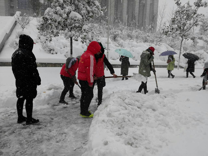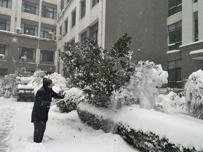 今冬的第一场雪比往年来的都要猛烈。一夜过后,雪堆积成厚厚的一层,道路突然消失了,师生出行极为不便。厚厚的积雪也让门前的树都弯下了腰,折断了枝干。2018年1月4日一大早,院长尹健带队,我院师生自发组成志愿服务队,进行2A实验楼周边路面积雪清理和树枝除雪。