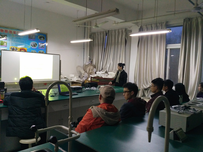 2017年3月3日,植物保护教研室潘鹏亮老师组织其课题组(2017届植物保护专业毕业生)在昆虫学实验室开展毕业论文中期检查。其中6位毕业生汇报了课题研究进展,2018届毕业生进行了现场观摩。