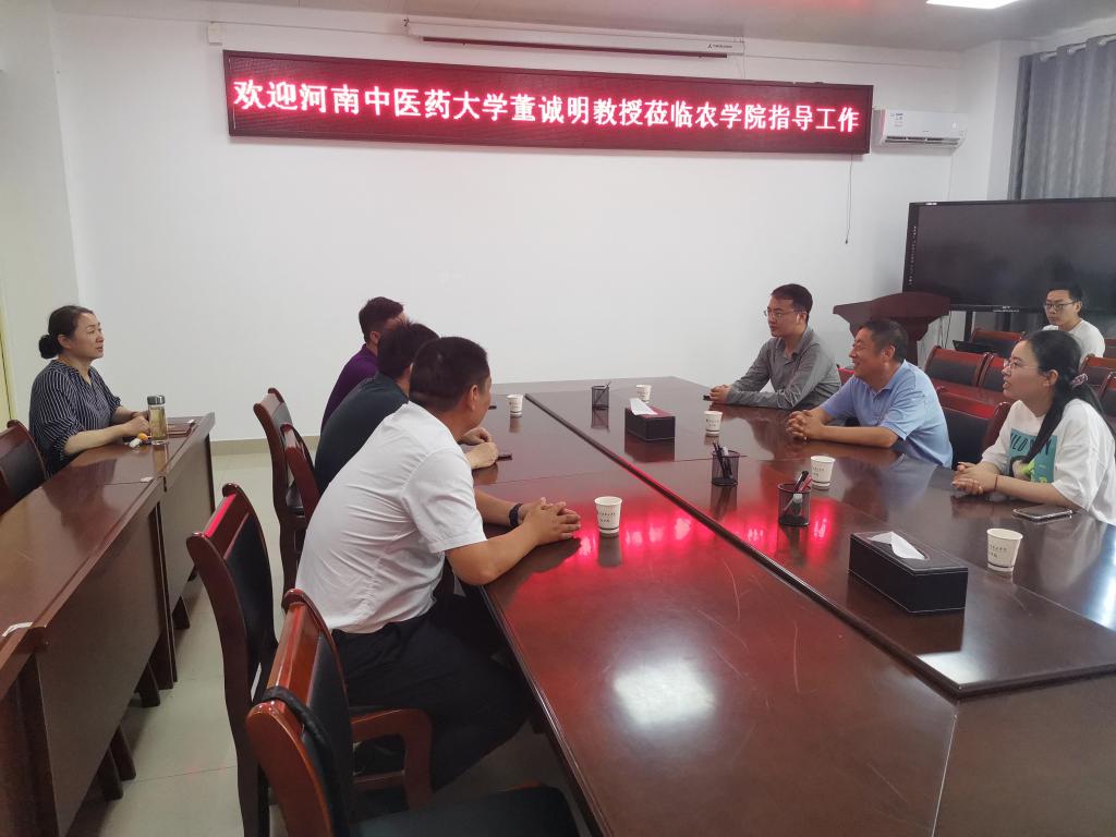 2022年6月11日,河南中医药大学药学院副院长董诚明教授受邀到beat365在线平台官网农学院,考察指导我院中草药栽培与鉴定专业建设工作。农学院院长尹健、教学质量监控与评估中心副主任孙万慧、教务处实践教学科科长杨俊杰、中草药栽培与鉴定专业负责人张艳玲和教研室专业教师参加了座谈会。