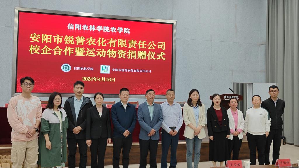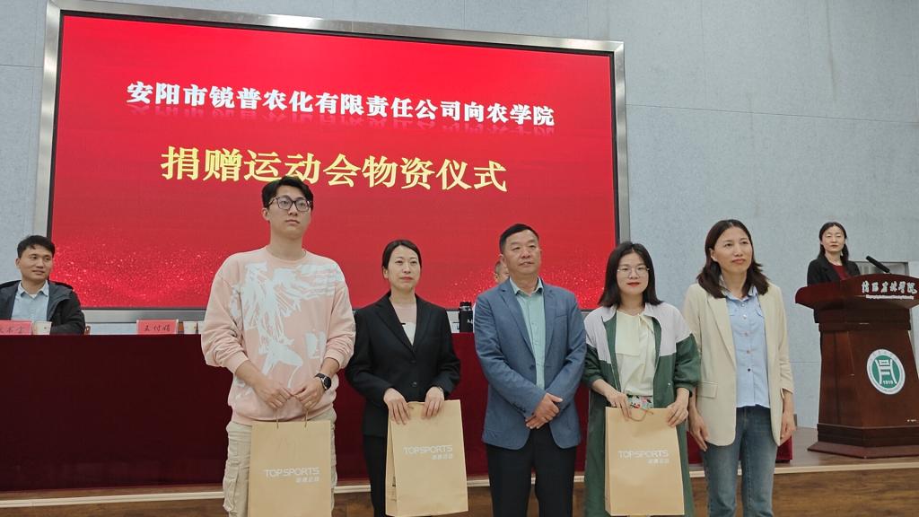 春和景明,惠风和畅。4月16日下午,我院与安阳市锐普农化有限责任公司举行校企合作暨运动物资捐赠仪式,仪式在学术交流中心多功能会议室举行。安阳市锐普农化有限责任公司常务副总郭齐、办公室主任杨素菊,学院班子成员、各教研室主任以及第十届校运会运动员代表在内的农学院师生参加本次仪式,仪式由副院长董丽平主持。