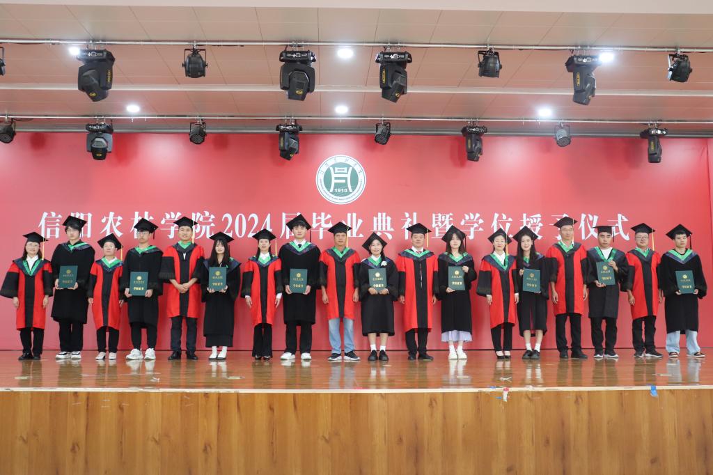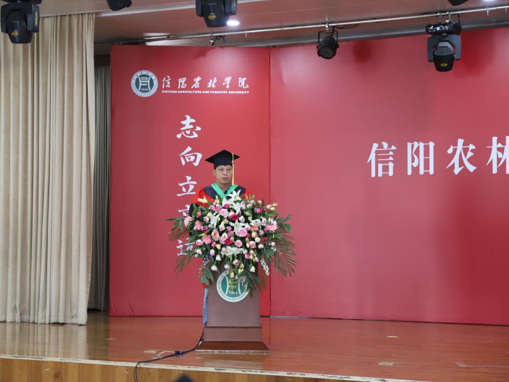 毕业典礼在国歌声中拉开了序幕。学院学位评定分委员会副主席、学院副院长董丽平副教授宣读了2024届本科毕业生学士学位授予决定。学院学位评定分委员会委员,学院副院长耿书宝副教授宣读了2024届毕业生学士学位授予名单,向圆满完成学业,获得学位的同学们表示热烈的祝贺。随后,教师代表刘合满教授、毕业生代表曾文博和在校生代表赵俊凯依次上台发言。学校学位评定委员会委员、农学院学位评定分委员会主席、学院院长陈利军教授为2024届毕业生致辞,他对毕业生提出了三点期望:一是坚定理想信念,矢志不渝;二是立足专业特长,谱写辉煌;三是持续保有本真、芳华永继。随后,在热烈的掌声中,学院学位评定分委员会教师依次为2024届毕业生拨苏正冠、颁发学位证、合影留念。最后,学院党总支书记李传保作总结讲话。他指出,在人生新的征程上各位毕业生要紧跟时代步伐,展现新青年新风貌。一是要赓续奋斗精神,做新时代的不懈奋进者;二是要焕发创新精神,做新时代的坚定开拓者;三是要弘扬奉献精神,做新时代的无私奉献者。