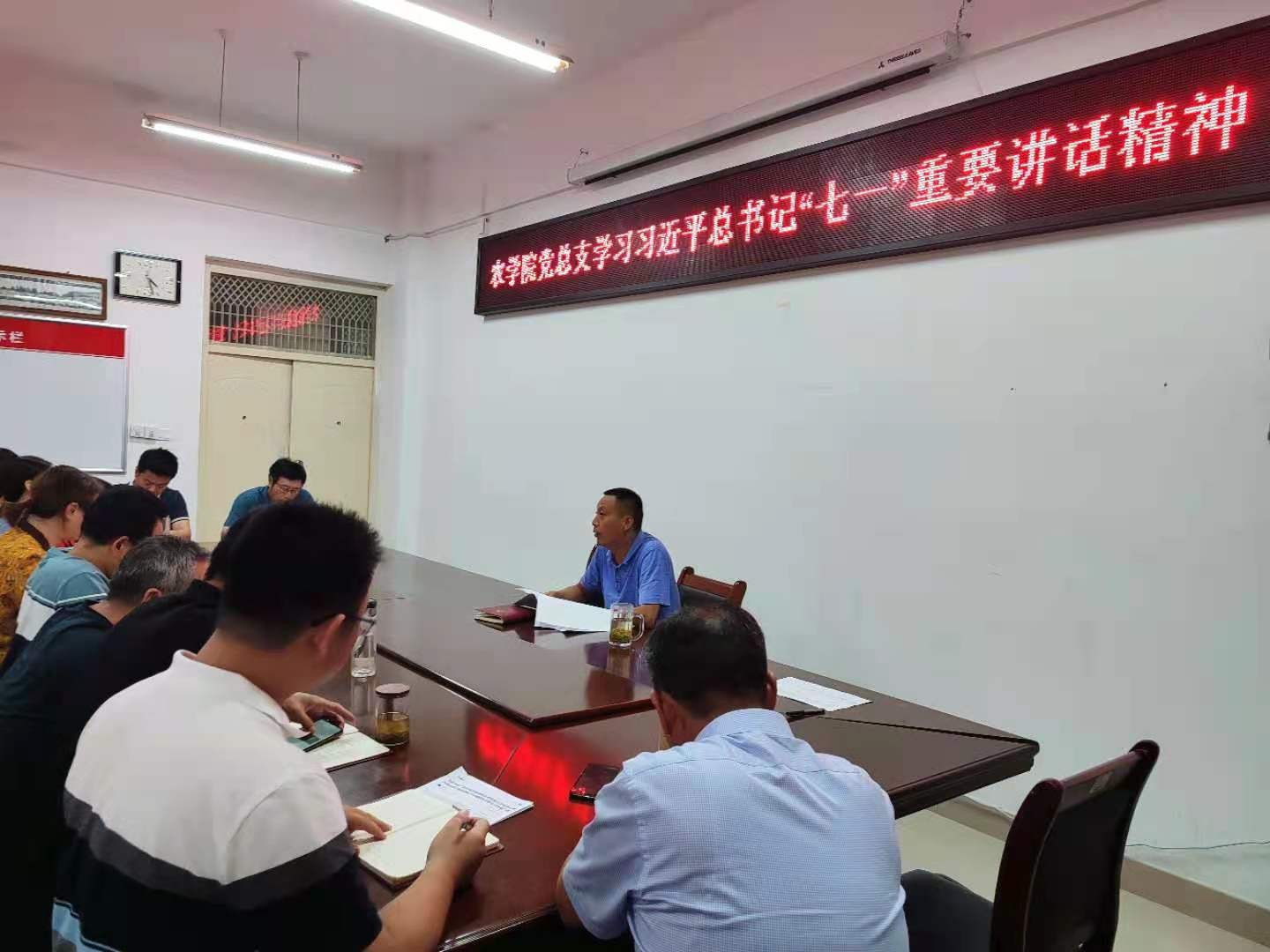 2021年7月1日,习近平总书记在庆祝中国共产党成立100周年大会上发表了重要讲话。根据校党委的统一部署,7月12日下午,农学院党总支在会议室2A316组织全体教师党员由党总支书记李传保领学了“七一”重要讲话精神。