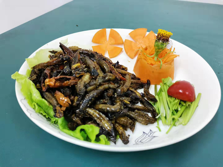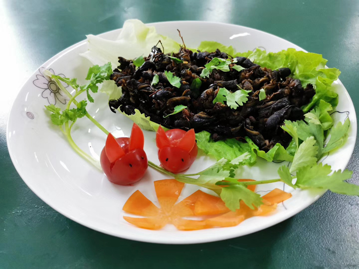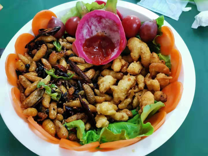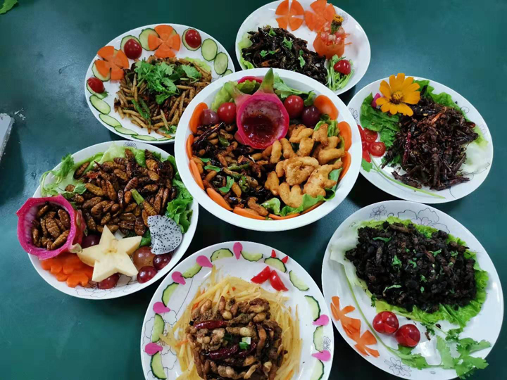 在制作药用昆虫宴的整个过程中,同学们积极参与,小组成员各有分工,清洗昆虫、挑选食材、构思造型、烹饪佳肴等,在精心的劳动和设计中,一个个成品跃然而出。