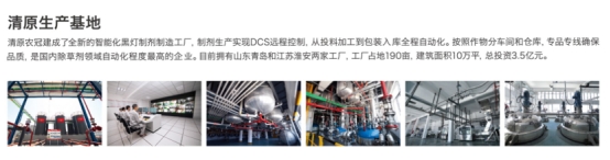 集团现拥有青岛清原农冠抗性杂草防治有限公司、江苏清原农冠杂草防治有限公司等两家子公司作为生产基地,保证充足产能满足市场需求。