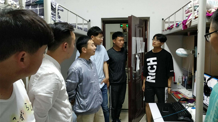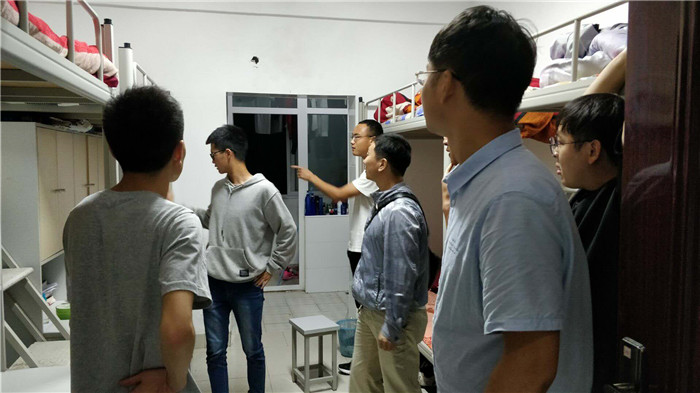 为了掌握学生宿舍安全状况,保障学生人身安全。2018年5月9日晚,院团总支书记杨林带队,学工组教师金明慧、刘书含和徐运飞分别对学院大一男女生宿舍进行突击检查。